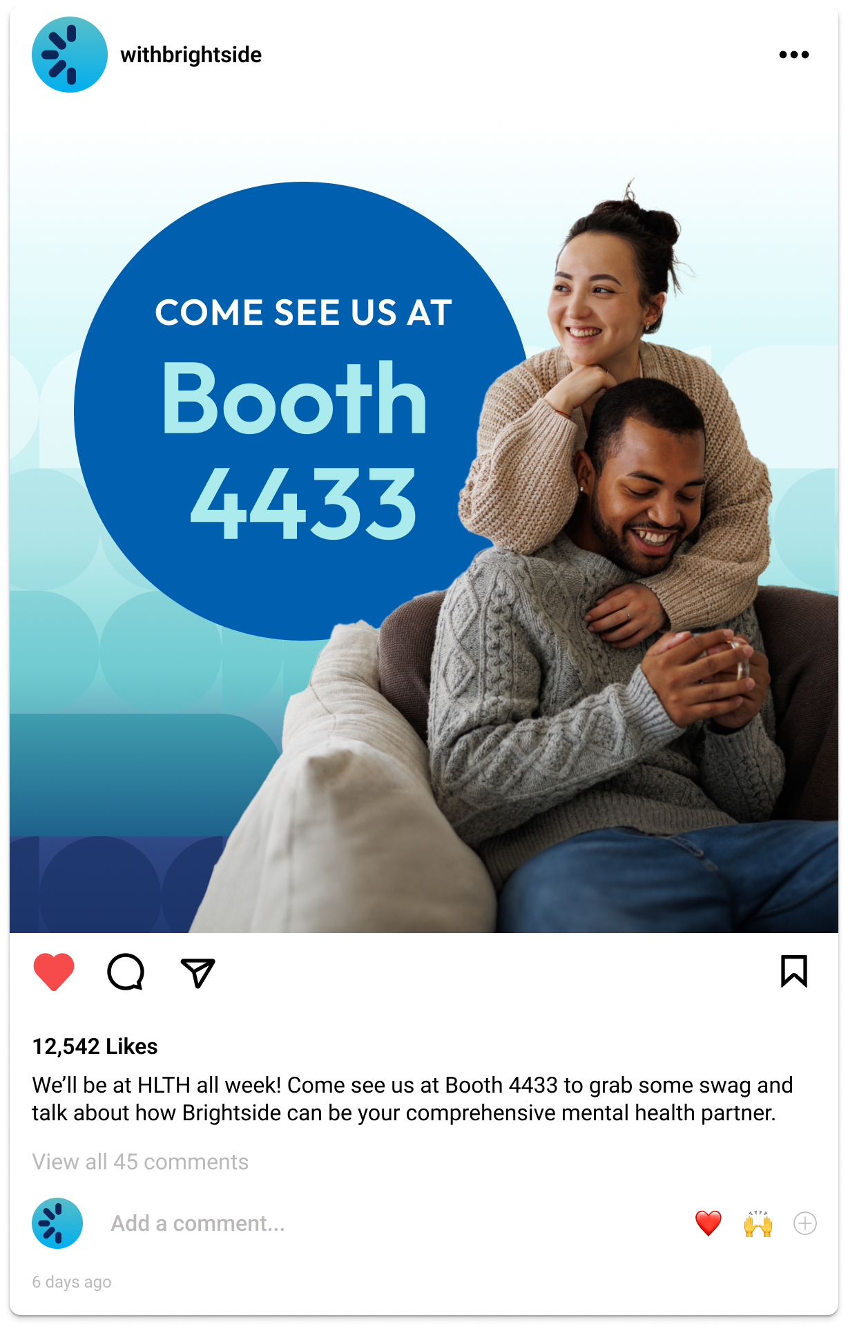 For Brightside’s presence at the HLTH conference, I led art direction and production across digital and print, including booth design, collateral, swag, a looping video, and a supporting social media campaign. Our goal was to stand out on a crowded tradeshow floor and create excitement that drove attendees to visit our booth, while ensuring every touchpoint felt cohesive and on brand.
